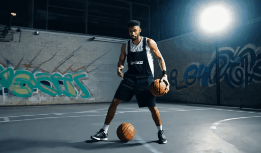 ( 提示詞:Dynamic tracking shot, following the man’s movement, High-contrast lighting with a spotlight on the basketball, Subject A young man in stylish black overalls, Dribbling the basketball with flair and precision, An outdoor basketball court with vibrant graffiti art, Energetic )