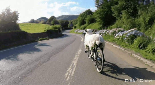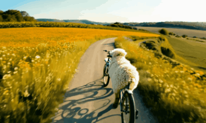 ( 提示詞:Playful POV shot, following the sheep as it rides, Warm, sunny day, A fluffy white sheep perched atop a vintage bicycle, Pedaling enthusiastically, weaving through the countryside,A winding country road lined with wildflowers, Whimsical, joyful )