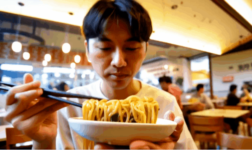 ( 提示詞:Warm, inviting lighting, A person with a focused expression, Using chopsticks or a fork to skillfully slurp up the noodles, A casual dining environment, Enjoyable, satisfying )