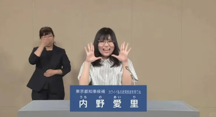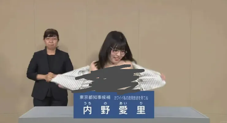比如,一位名為內野愛裏女企業家,一邊説着“請看可愛的我在電視裏發表政見哦”,一邊突然脱下了衣服。
