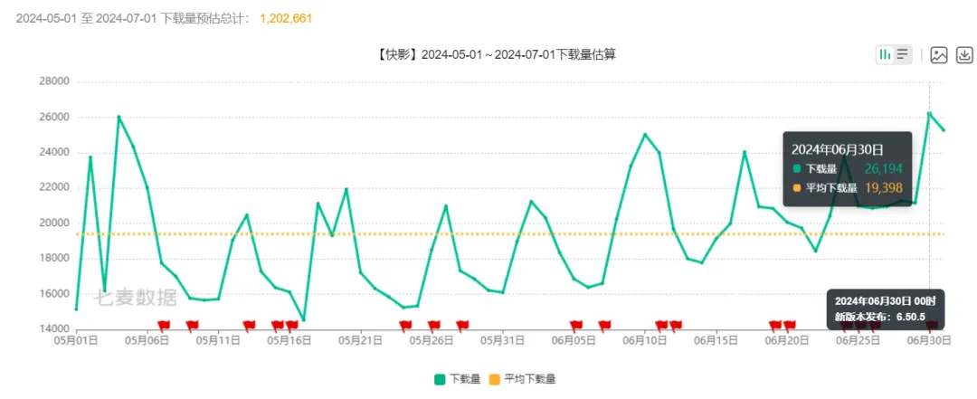 七麥數據顯示的iOS端數據,進入六月後,隨着可靈大模型在快影App的公測,應用下載量在一個月的時間內始終波動上升,峯值單日下載量超過26000,預估單月下載量超過62萬。