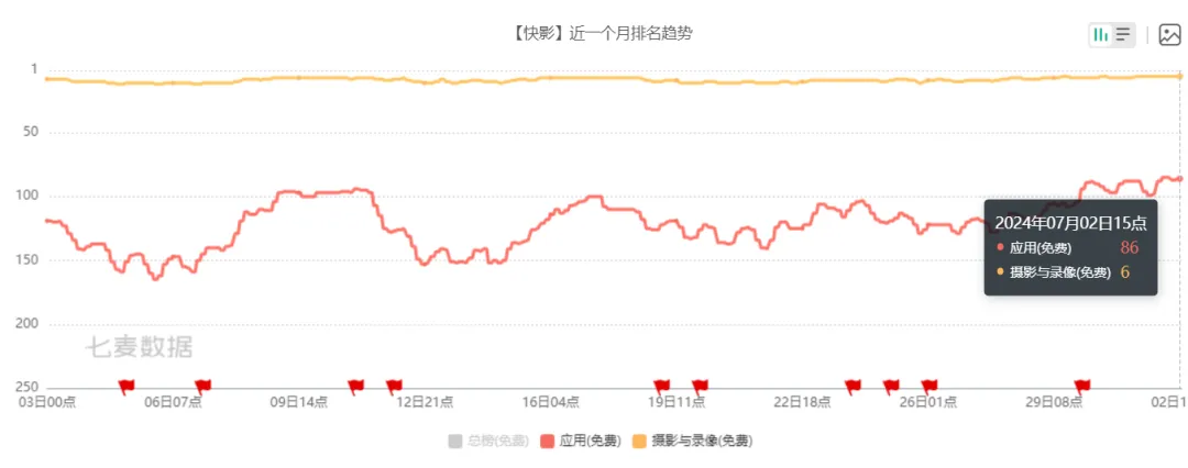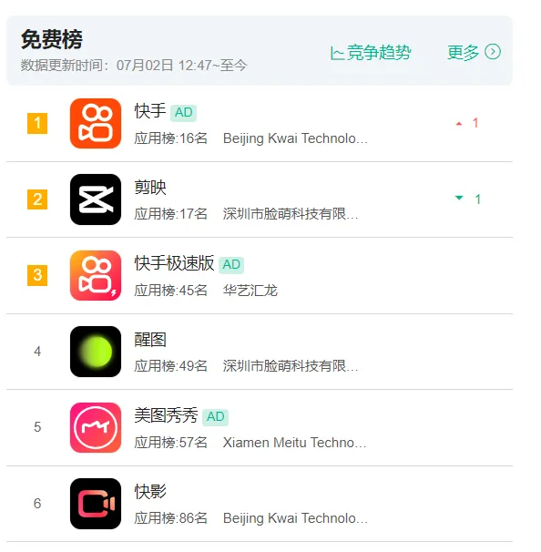 對於一款定位創作工具的App來説,這個數據確實可觀。近一個月,快影在攝影與錄像App榜單中始終位處於前十五位,目前已經高居第六,前五則是老幾位圖像、視頻領域的國民級App。