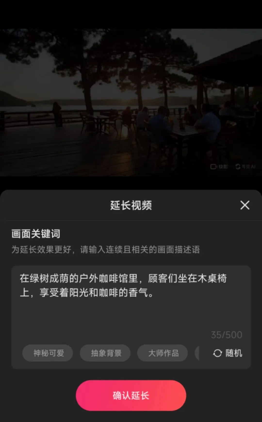 5秒的原視頻被延長到了10秒左右,官方稱視頻時長最多可達兩分鐘(幀率30fps)。但若要達到這個最大時長,意味用户着需要延長視頻數十次,並等待極長的時間,顯然對於用户來説,投入產出比並不理想。