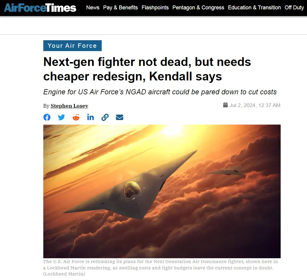 筆者的這種樂觀態度當然是有根據的——美國《空軍時報》7月1日發佈了對美國空軍部長肯德爾的獨家採訪。最近有傳言稱,由於美國空軍正在同時推進成本嚴重超支的“哨兵”洲際導彈和B-21“突襲者”隱形轟炸機項目,它們是美國“三位一體”核力量的主要支柱,重要性遠超NGAD項目。因此對於資金短缺的美國空軍而言,NGAD項目可能會受到威脅。6月13日,美國空軍參謀長阿爾文就暗示,在美國政府的2026財年預算中,軍方領導人可能會建議重新配置、延遲,甚至取消NGAD項目。