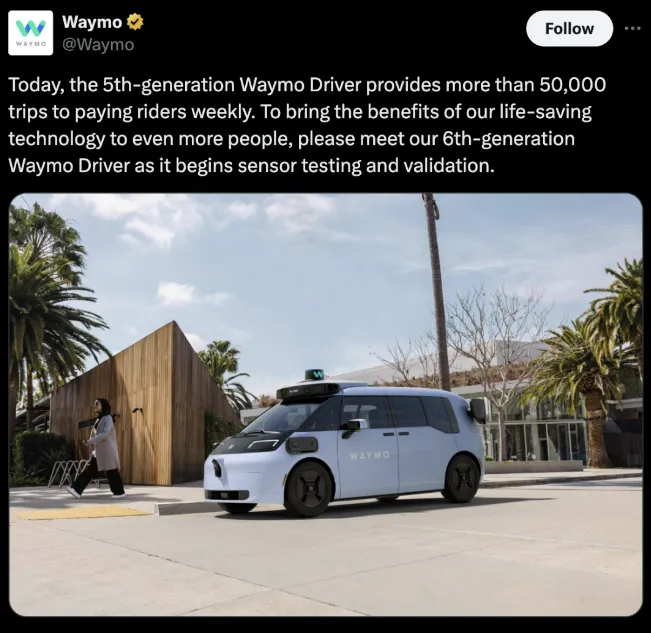 就在今年6月,Waymo 宣佈公司第六代Robotaxi將開啓傳感器和穩定性測試,第六代Waymo Driver是前裝量產的Robotaxi。根據官方發佈的宣傳圖,第六代Waymo Driver採用的傳感器方案配置也會有頭頂激光雷達,車輛前面有1顆激光雷達,周邊4顆激光雷達。新一代Robotaxi還能在較冷的地方行駛,這意味着Waymo將擴大的運營範圍。