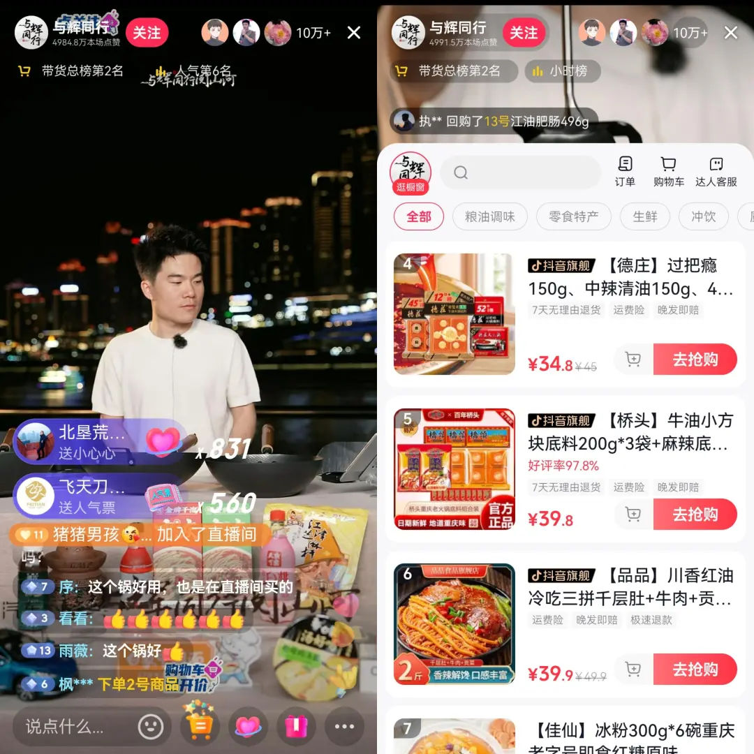與輝同行和東方甄選,在某種程度上構成了競爭關係:兩者主要帶貨的產品都是食品飲料和生鮮蔬果,略有不同的是與輝同行是導購式直播間,售賣着其他商家和品牌的產品,東方甄選帶貨的商品則以自營商品為主。