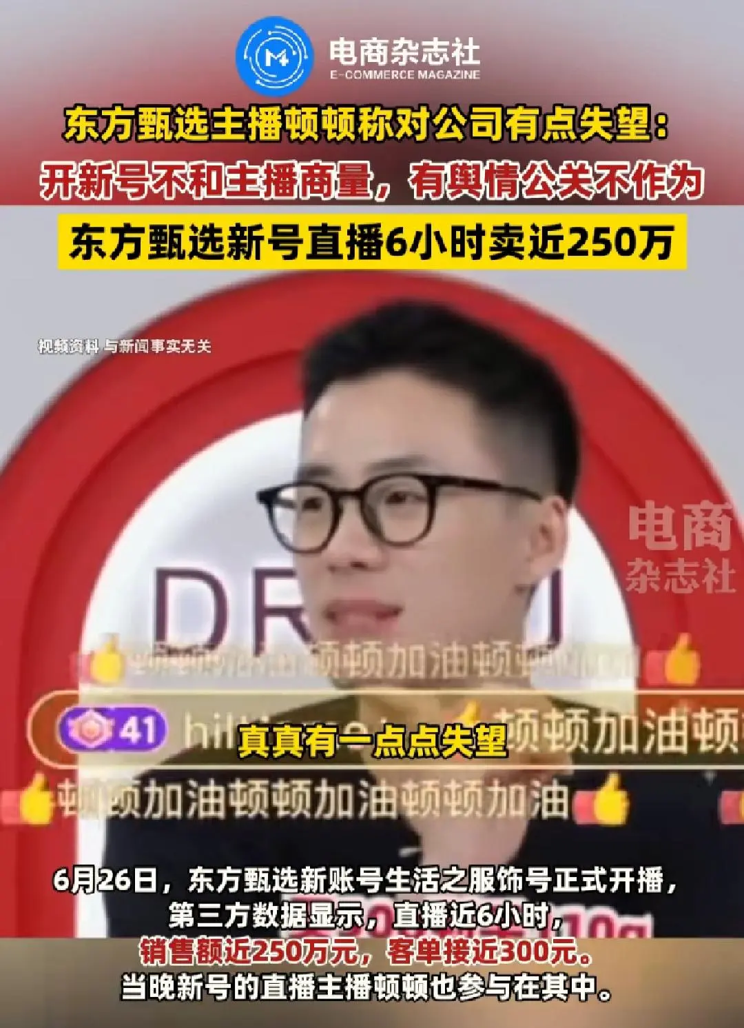 去年12月,東方甄選的小編在評論區用一條評論引發小作文事件,讓東方甄選和董宇輝陷入爭議之中;今年6月,東方甄選的頭部主播之一的頓頓,在直播間公開表示對公司“真正有一點點失望”,再度把東方甄選拉進輿論風波之中。