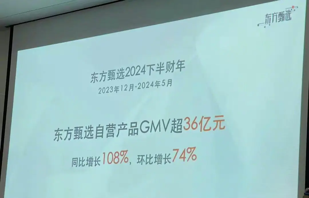 6月19日,東方甄選透露,2024下半財年(2023年12月至2024年5月),東方甄選公司自營產品GMV突破36億元,同比增長108%,環比增長74%。