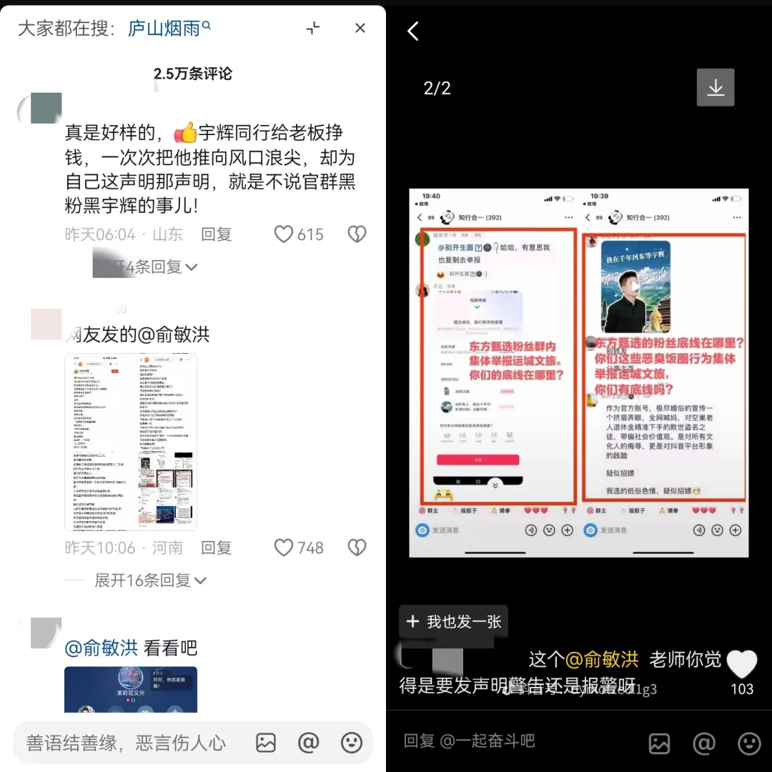 謠言中,東方甄選和董宇輝形成了對立,而闢謠聲明中東方甄選將近期的負面爭議稱為“有組織的造謠抹黑”,讓眾多董宇輝的“丈母孃”感到不滿。她們聚集在俞敏洪的抖音賬號評論區,發出截圖質疑東方甄選粉絲在惡意針對董宇輝,喊話俞敏洪要“一碗水端平”。