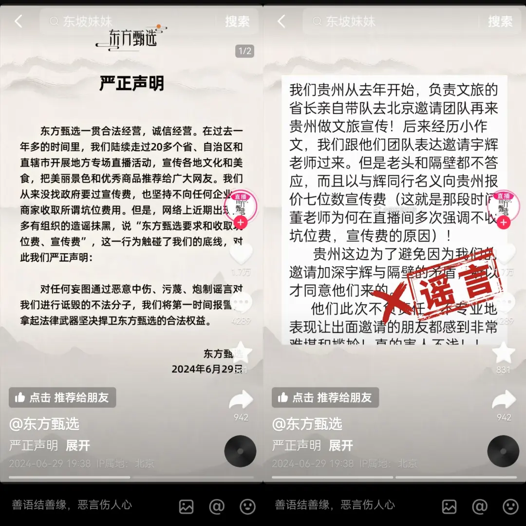 面對這些爭議,東方甄選進行了冷處理,卻在6月29日出乎意料地發出一則聲明,表示東方甄選從未收取過坑位費、宣傳費,並且附上謠言全文:貴州文旅想邀請董宇輝“老師”,但被打着董宇輝旗號的東方甄選“老頭”收了宣傳費。俞敏洪也在個人抖音賬號上表示,“不接受造謠和誹謗”。