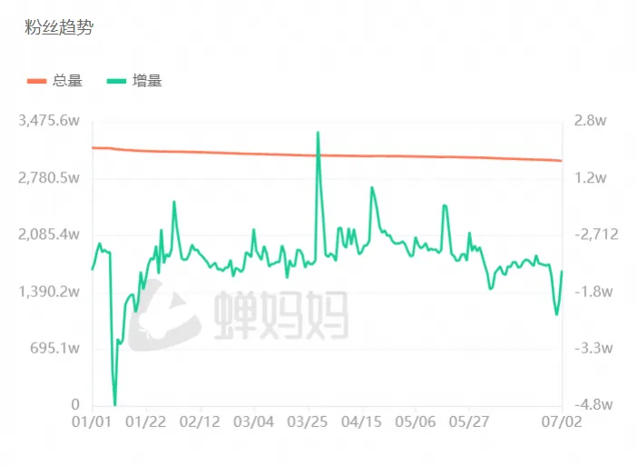 蟬媽媽數據顯示,今年以來,截至7月2日,東方甄選賬號掉粉158萬,而與輝同行則漲粉1742萬。同時,在6月帶貨達人榜上,與輝同行排名第2,僅次於廣東夫婦,而東方甄選直播間則跌出了前10,排名第13。
