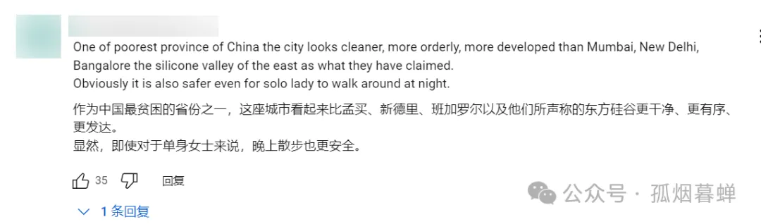 “就算這真的是中國最貧困的省份之一,柳州這座城市看起來也比孟買、新德里、班加羅爾以及他們所聲稱的‘東方硅谷’更乾淨、更有序、更發達。而且,很顯然,對於單身女士來説,柳州也比它們更適合出門散步。”