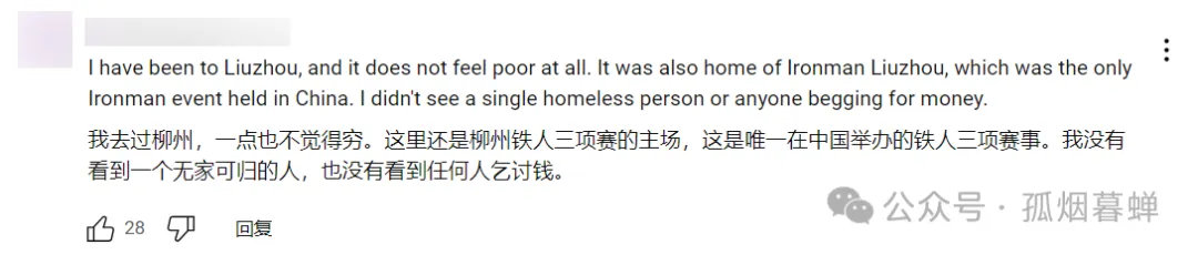 “我去過柳州,我一點也不覺得柳州窮。柳州是中國鐵人三項賽的主場所在地,這也是唯一在中國舉辦的鐵人三項賽事。我沒在柳州看到哪怕是一個無家可歸的人,也沒有看到任何乞丐當街管我要錢。”