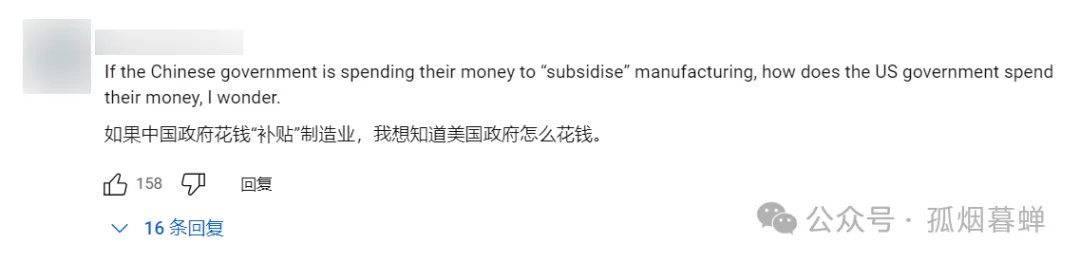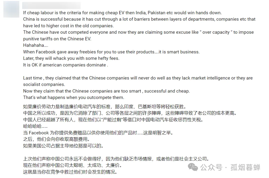 “如果廉價勞動力就是造出廉價電動車的關鍵因素,那麼這頭把交椅根本就輪不到中國來坐,印度、巴基斯坦……有的是國家的人力成本比中國的更便宜。中國之所以成功,是因為它消除了各部門、各公司、各層級之間的許多障礙,為電動車行業的蓬勃發展創造了良好的環境。中國人已經超越了其他所有人了,而那些人現在在做什麼呢?他們完全競爭不過中國,只好以所謂的‘產能過剩’等蹩腳藉口對中國電動車徵收懲罰性關税。呵呵噠,簡直笑死個人。之前説中國公司永遠不會做得更好的就是這幫人,因為中國人這也不行、那也不行,因為它們是一個社會主義的公司;現在抱怨中國公司太聰明、太成功、把產品價格壓得太低的還是這幫人。這就是當中國在公平競爭中勝過美國時會發生的情況。”