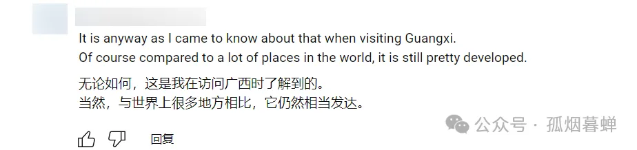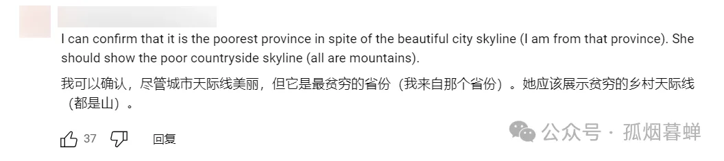 “我可以向你保證(不知道是不是廣西人),儘管柳州的天際線很漂亮,但它確實是中國最貧窮的省份——因為我就是廣西人。NBC主持人的畫面展示不對,廣西到處都是山,她應該多讓人們看看廣西那貧窮的鄉村天際線,而不是過多地關注廣西城市化的一面。”