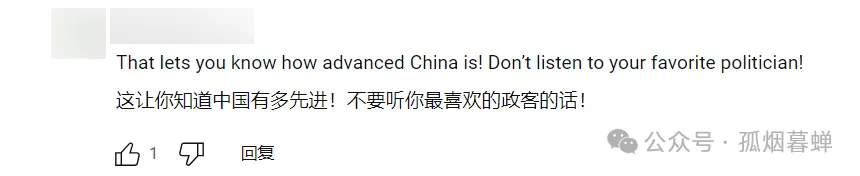 “這下你知道中國有多先進了吧!別聽那些反華政客的鬼扯,他們淨挑你們愛聽的説。”