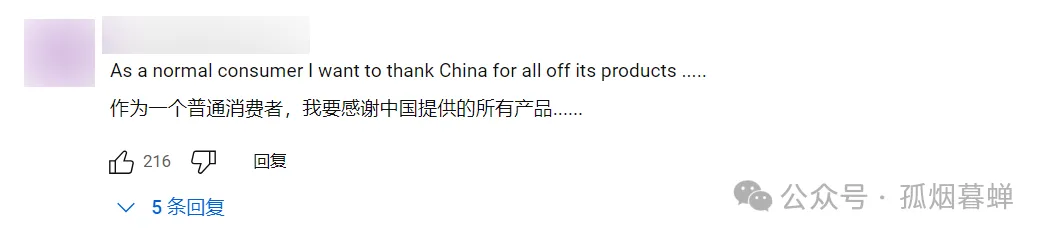 “身為一個普通消費者,我得向中國説聲謝謝。得虧有中國啊,要不然我們哪能享受到所有這些物美價廉的好產品啊……”