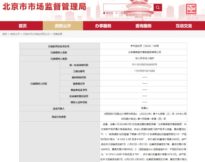 今年6月5日,北京市市場監管部門對北京美萊醫療美容醫院進行了處罰。處罰決定書顯示,北京美萊醫療美容醫院在美團店鋪上對多款產品開展價格促銷活動,執法人員隨機抽取幾款產品予以核查後發現,促銷減價或折價後的實際價格,比促銷活動前的實際成交價還要高,屬於典型的價格欺詐行為,最終市場監管部門對北京美萊處以10萬元的重罰。