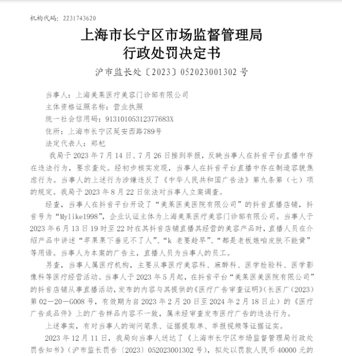 去年底,上海長寧區市場監管局對上海美萊醫療美容門診部有限公司進行了公開處罰,上海美萊醫療在直播間製造容貌焦慮,且發佈的廣告內容與提交審查的廣告樣品內容不一致,屬於未經審查發佈醫療廣告的違法行為,最終被罰款四萬元,並責令改正。