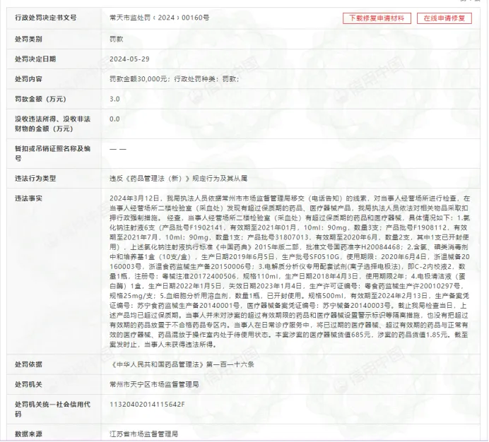 今年5月底,常州市市場監管部門對常州美萊醫療美容下達了罰單,罰單內容顯示,在3月份的檢查中,市場監管部門發現常州美萊醫療美容有超過保質期的藥品、醫療器械產品,並且在日常診療服務中,將已過期的醫療器械、超過有效期的藥品與正常有效的醫療器械、藥品混放於操作室內處於待使用狀態,有部分過期藥品和器械已經被使用了!