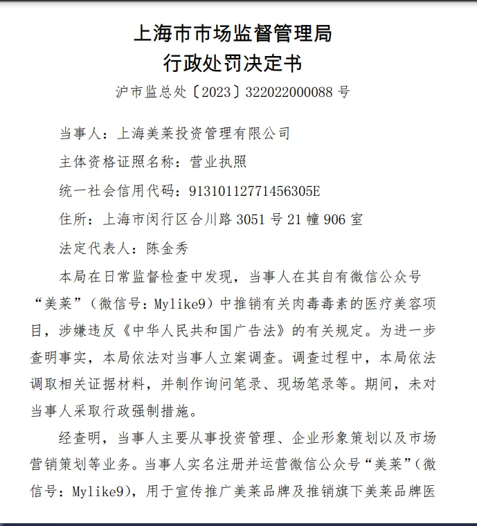 即便是作為全國多家美萊醫療美容醫院的控股股東,上海美萊投資管理有限公司,同樣因為在廣告中所推銷的醫美項目中使用的注射用A型肉毒毒素屬於醫療用毒性藥品範疇,此類產品屬於醫療用毒性藥品,而非普通的美容針劑,其有一定的特殊性,不能做廣告,因此這家美萊醫療美容醫院的母公司也曾被重罰了20萬元。