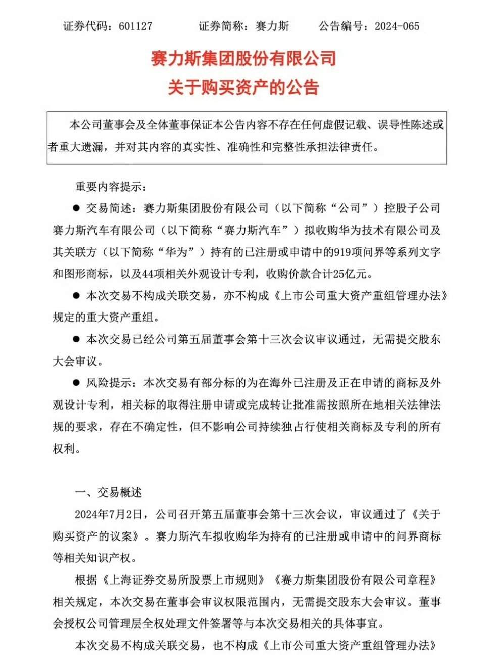 2024年7月2日,賽力斯發佈公告顯示,賽力斯擬收購華為持有的全球所有類別“問界”及其他相關商標權及申請權、相關外觀設計專利,收購價款合計25億元。