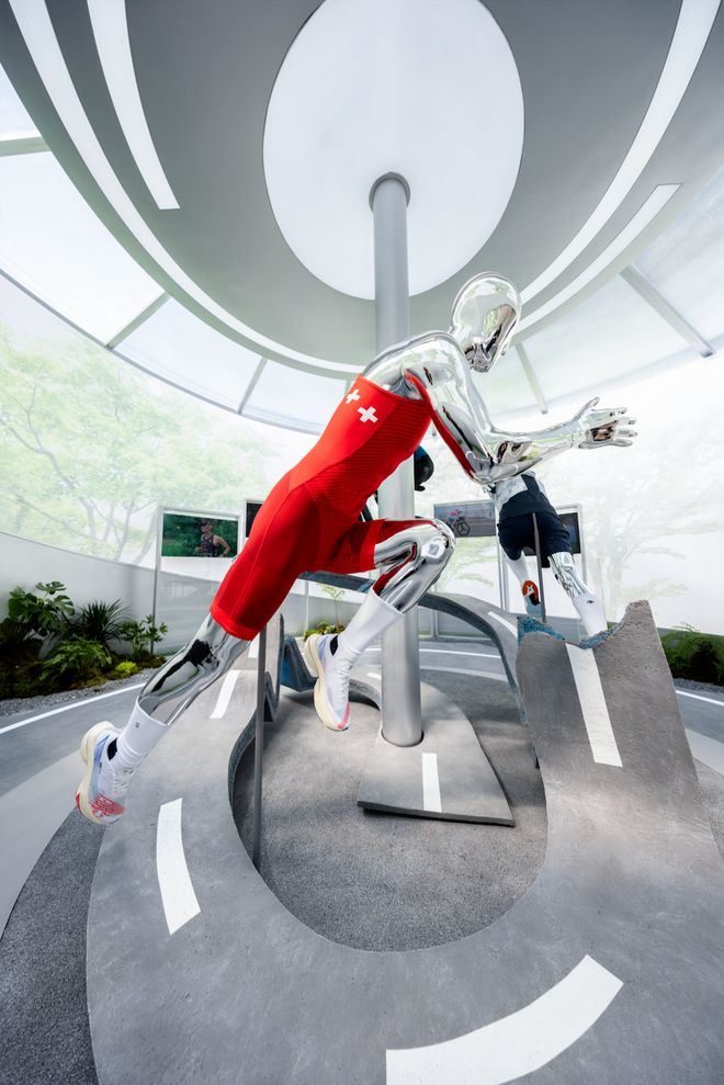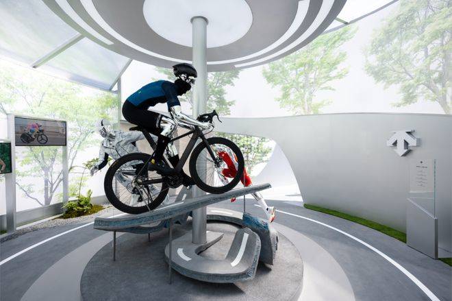 與此同時,迪桑特破風空間站也於比賽前一天在瀋陽萬象城正式啓幕。在這一特別打造的空間場景內,**不僅展示了迪桑特為鐵三運動員和國家隊打造的專業比賽裝備,還通過對於鐵三比賽中風景的佈置以及TEAM DESCENTE故事的呈現,**讓每一位身處其中的人都彷彿騎行穿梭公路,深入感受「破風精神」的內核。