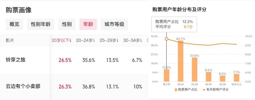 毒眸此前在五一和端午的檔期覆盤中都曾提到,今年以來,口碑票房倒掛現象普遍,《末路狂花錢》《我才不要和你做朋友呢》等影片口碑表現均不佳,但都是檔期內票房冠軍。顯性口碑不再是影響票房的關鍵因素。內在邏輯是,“專業觀眾”的口碑和“普通觀眾”的口碑越來越不同,一部分人眼中的“爛片”在另一部分人眼中是“好電影”,觀眾的需求是找到更符合自己觀影審美的影片。而特別喜歡《雲邊有個小賣部》的這羣觀眾,在畫像上又有比其它影片更加明顯的特徵。首先是年齡結構上極度年輕。《雲邊有個小賣部》的00後觀眾(24歲以下觀眾)佔比在貓淘平台分別高達63.6%和53%,這一年齡結構比去年一整年年輕觀眾佔比最高的《鈴芽之旅》的62.1%和49.4%還要高,是一個非常誇張的比例。在國產片普遍平均觀影年齡偏大的情況下,更加屬於一個“異類”。