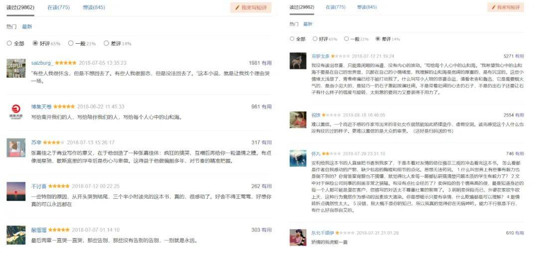 通過華麗過程來尋求快感,是一部分暢銷書的共通路徑。90後成長過程中愛看的郭敬明、到現在成為梗的大冰,大抵也是相同的脈絡。值得一提的是,《雲邊有個小賣部》原著在豆瓣的評分高達7.4分,但點開短評頁面會發現,65%的好評的“有用”數量遠遠少於14%的差評的“有用”數量。這或許從另一個角度體現了,喜愛張嘉佳的這部分讀者,在互聯網語境中處於話語權的弱勢地位。