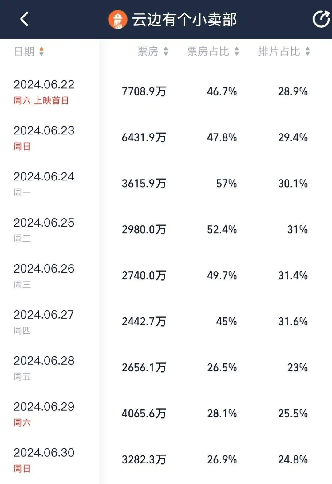 和《周處除三害》一樣,檔期環境是造就票房“黑馬”的重要因素,《雲邊有個小賣部》上映之際恰逢大盤冰點。首周內稍有競爭力的影片僅《頭腦特工隊》,這讓《雲邊有個小賣部》的排片佔比持續保持在30%左右,進入次周,《海關戰線》和《寂靜之地:入侵日》的上映,才進一步分走更多排片,讓其回落到25%上下。