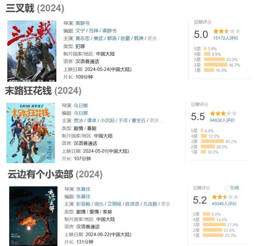 很多人沒想到的是,暑期檔的第一個爆款,從《雲邊有個小賣部》開始。雖然這個爆款的程度比起去年《消失的她》遠遠不及,但放在冷冰冰的上半年大盤裏,已經是一匹不可小覷的“黑馬”。截至發稿前,燈塔專業版和貓眼專業版給出的預測票房分別為6.4億和5.83億,這是可以躋身2024年目前為止年度前十的水平。割裂的是,《雲邊有個小賣部》的豆瓣評分僅有5.2,這是一個比許多網絡電影還低的分數,在豆瓣2024所有國產院線片裏,是倒數前五的水平。