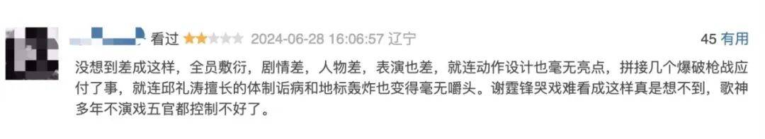 “沒想到差成這樣,劇情差,人物差,就連動作設計也毫無亮點,拼接幾個爆破槍戰應付了事。”