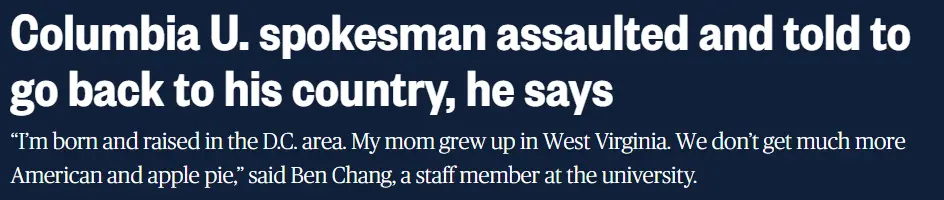 被襲擊的張本恩並不是普通的華裔。他今年52歲,從小在華盛頓特區出生和長大,畢業於喬治城大學外交學院(School of Foreign Service at Georgetown University)。自2022年5月起擔任哥大的副校長兼發言人。還曾經在布什和奧巴馬政府期間擔任白宮國家安全委員會新聞和通訊主任,以及美國駐聯合國代表團副發言人。可謂是履歷豐富,可是就是這麼一位人物,居然也會遭到種族歧視。