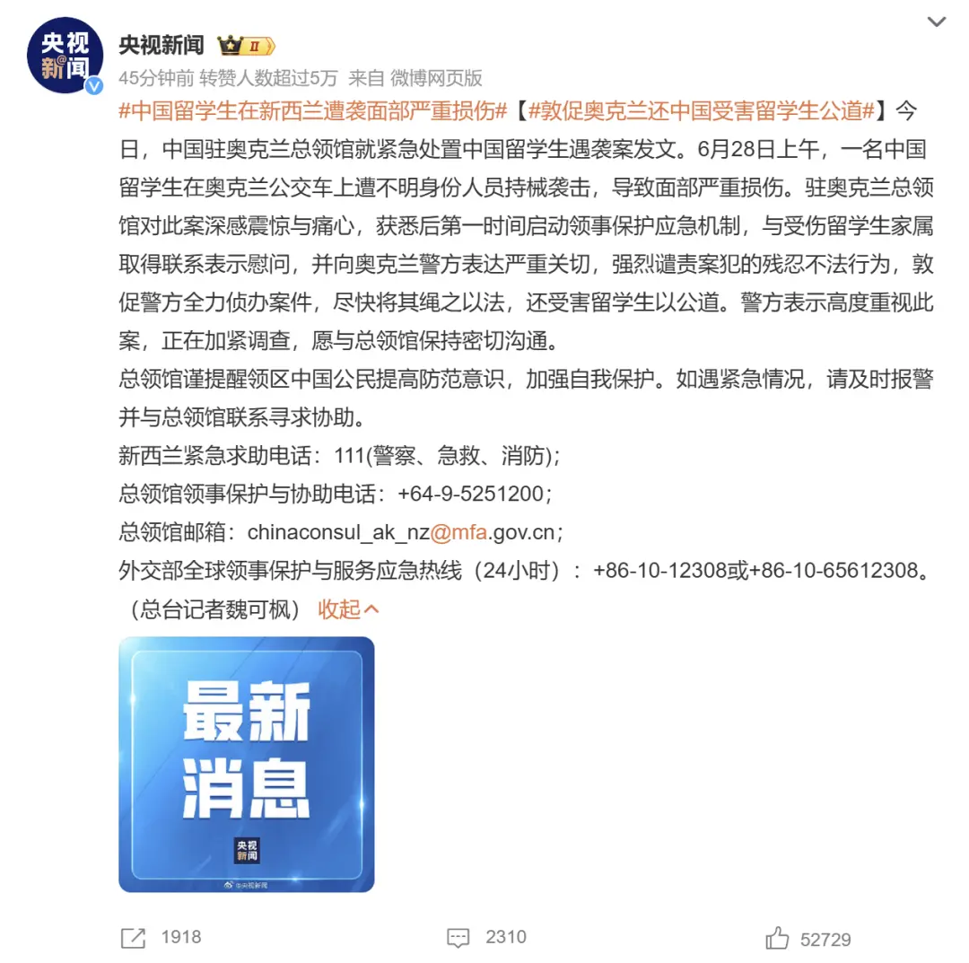 為此,駐奧克蘭總領館也是第一時間發文,對此案深感震驚與痛心,並迅速啓動了領事保護應急機制,與受傷留學生家屬取得聯繫表示慰問,並向奧克蘭警方表達嚴重關切,強烈譴責案犯的殘忍不法行為,敦促警方全力偵辦案件,儘快將其繩之以法,還受害留學生以公道。警方表示高度重視此案,正在加緊調查,願與總領館保持密切溝通。