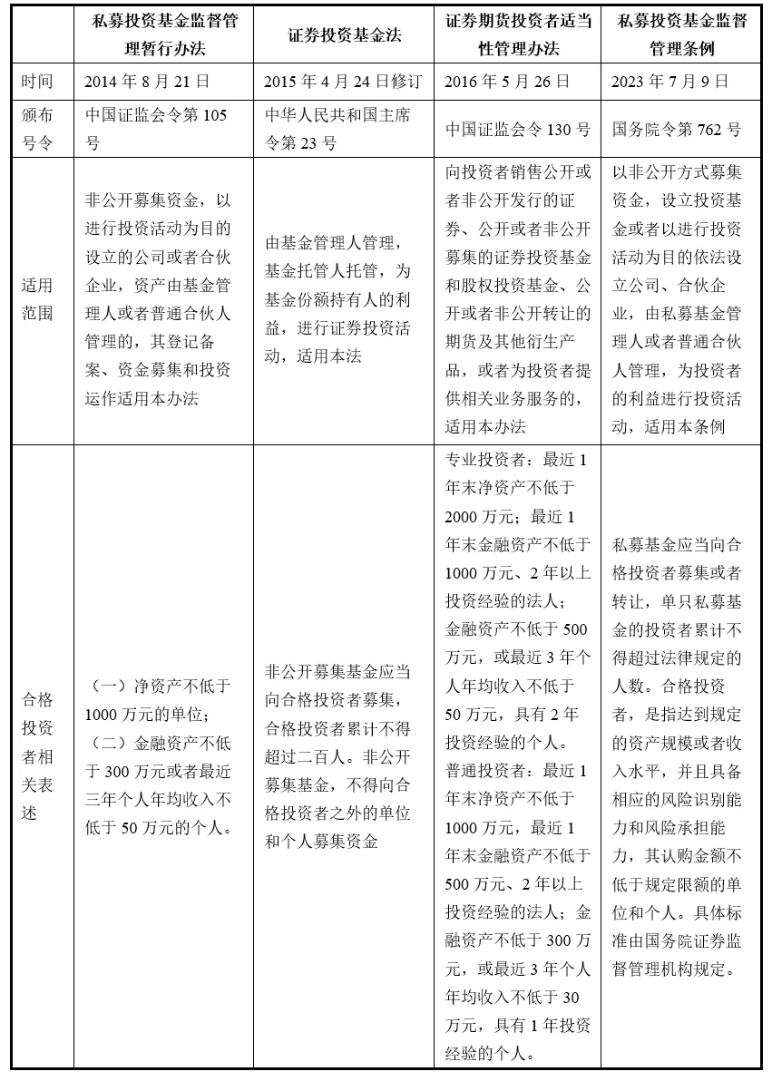 “合格投資者”一詞,最早出現在美國聯邦政府頒佈的《1933年證券法》。我國的投資者適當性制度開始於2008年4月國務院頒佈的《證券公司監督管理條例》。關於“合格投資者”的認定,相關法律法規包括《私募投資基金監督管理暫行辦法》《證券投資基金法》《證券期貨投資者適當性管理辦法》《私募投資基金監督管理條例》。