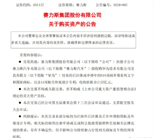 “賽力斯汽車擬收購華為持有的已註冊或申請中的問界商標等相關知識產權”。