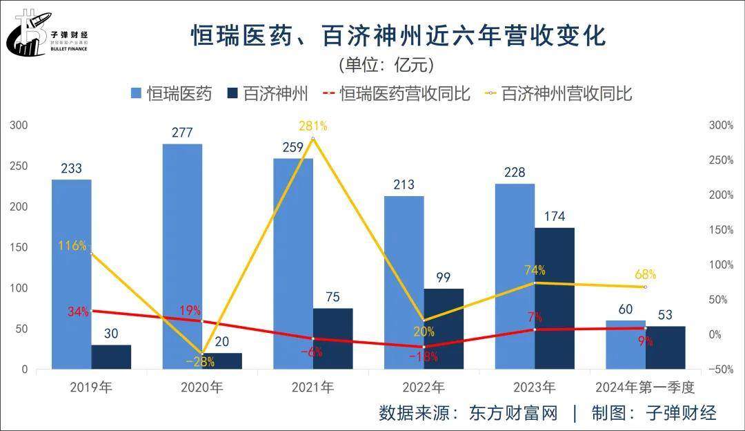 2019年,恆瑞醫藥比百濟神州營收多203億元。時間來到2024年第一季度,恆瑞醫藥營收60億元,百濟神州53億元,兩者的差距僅有7億元,差距不斷縮小。