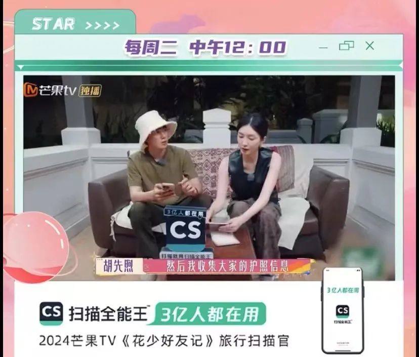 例如,誰也沒想到連掃描全能王這樣偏工作場景、B端服務場景的工具app也能化身為《花兒與少年·老友記》裏的“旅行掃描官”,還設有專門的中插小劇場,當胡先煦、江疏影拿着掃描全能王掃描證件完成收集信息定車票任務的時候,“掃得好清楚”“掃得好便利”等話術表達,進一步將旅行場景之下的信息處理問題給出了明晰解法。