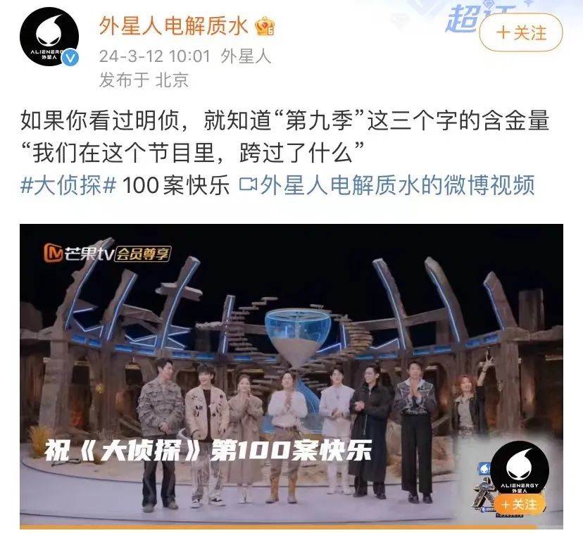 比如,《大偵探9》冠名商外星人電解質水不僅在每期節目播出前,在官微發佈當期的相關照片路透,並根據節目內容在微博推出看圖競猜送福利等活動,還在《大偵探9》開播100期等特殊的時間節點,主動製作回憶視頻、串連明偵宇宙,推出徵集百案印象最深刻的金句或橋段活動,並製作成“大偵探百案”熱別紀念款周邊當做贈送福利。