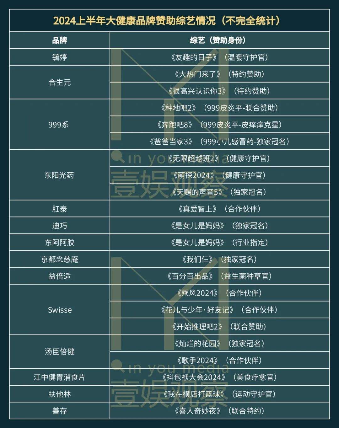 根據壹娛觀察(ID:yiyuguancha)不完全統計,大健康產品(包含藥品、保健品、智能健康產品等)在上半年的綜藝贊助數量超過20次,東陽光集團更是出現在《無限超越班2》《天賜的聲音5》《萌探2024》三檔頭部綜藝的贊助行列。