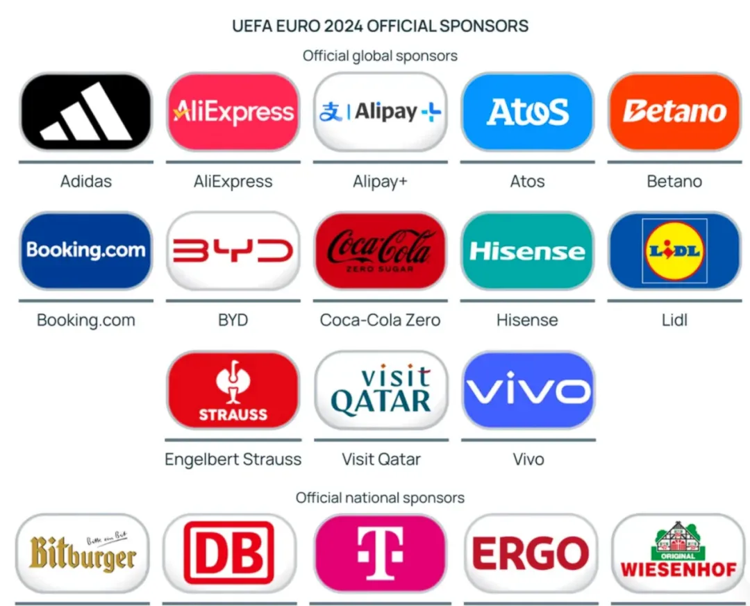 2024年歐洲盃官網顯示,今年賽事共擁有13家官方全球合作伙伴。其中包括速賣通、支付寶、比亞迪、vivo和海信5家中國企業,歷史性地佔據了近四成席位。