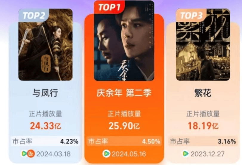 據燈塔出具的《2024H1劇集市場洞察報告》顯示,愛奇藝、優酷、騰訊視頻的H1劇集總播放量均實現增長,總播放量差額保持在4億之內,幾乎可以忽略不計,**市佔率也幾乎持平。**2024H1電視劇正片播放量排行top10中,騰訊視頻和愛奇藝分佔4部獨播劇,優酷1部,芒果TV參與1部拼播(《與鳳行》),但騰訊視頻的《慶餘年第二季》《與鳳行》和《繁花》包攬了前三,主打一個風光無限。