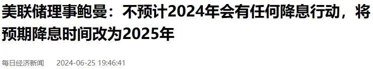 本來市場預測,美國會在2024年降息。但6月25日,美聯儲理事、永久票委米歇爾鮑曼突然表示,預期2024年不會有任何降息行動,將預期降息的時間推遲至2025年。