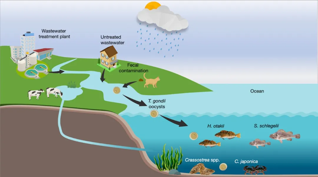 山東大學威海分校的一組研究人員在研究中調查了弓形蟲是如何從陸地到達海洋的。在研究中,他們捕獲了一些海洋入海口的牡蠣、螃蟹和魚類,來檢查弓形蟲是否在其中存在。結果發現**,陸地徑流流入海洋是弓形蟲卵囊入海的重要因素。**