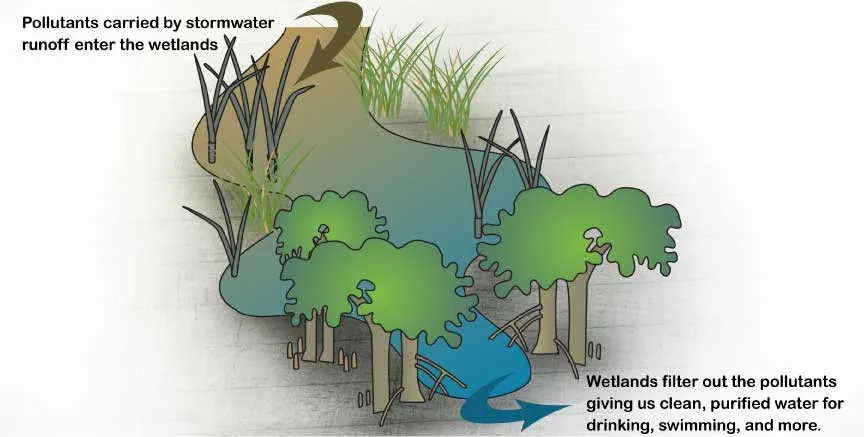 雨水會流經城市建築物、街道、人行道、停車場和其他不透水錶面,攜帶者沉積物、過剩營養物和有毒化學物質。而過剩營養物會從農田中沖走,並將污染物帶入雨水徑流中。這些雨水最終會進入附近的濕地並被吸收。|dnrec