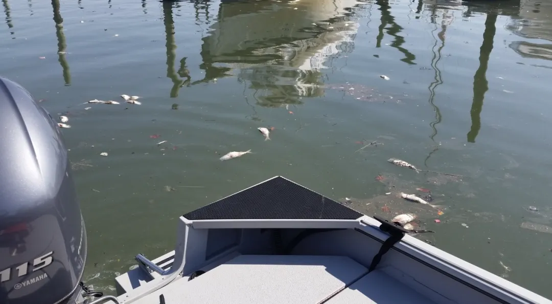 法拉盛溪水面上由於缺氧而死的鯡魚。|river keeper