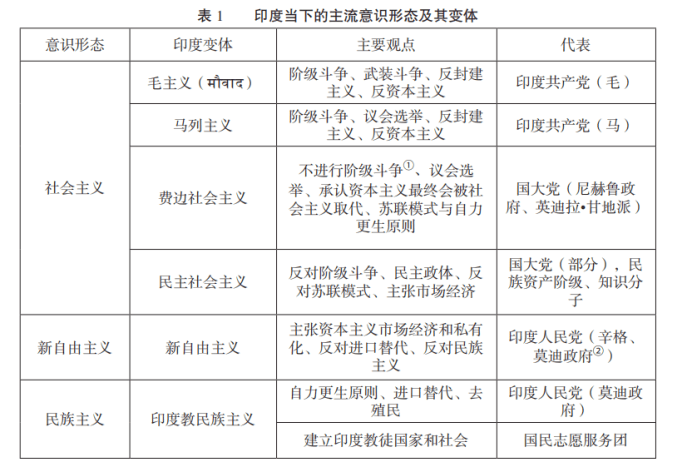 印度當下的意識形態和社會思潮可分為三類:**社會主義及其變體,民族主義及其變體,以及自由主義及其變體(見表1)。**莫迪政府以印度教民族主義指導政治、社會、文化和語言政策,以新自由主義指導經濟政策。印度左翼則在政策落實過程中以官員不配合、學者批評和羣眾示威遊行的方式進行反對。