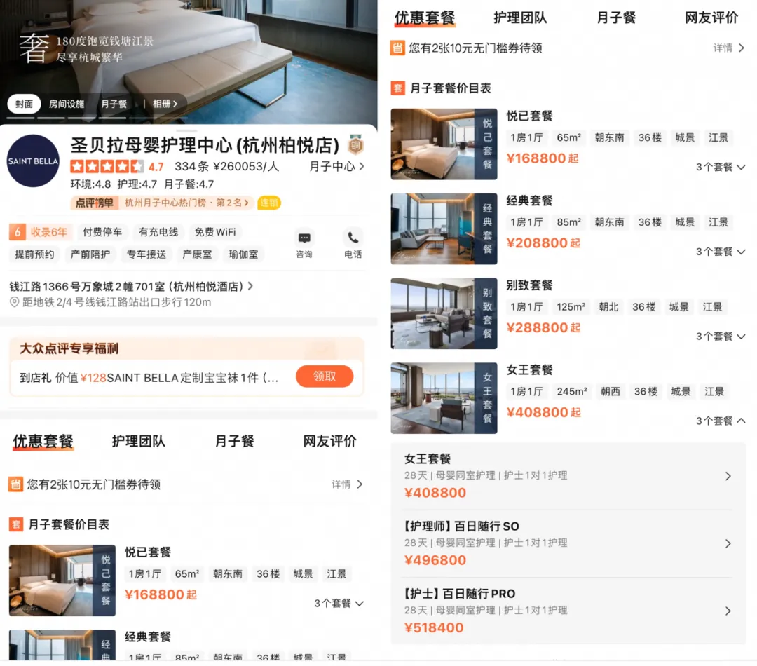 在小紅書上搜索“聖貝拉”,你會發現它高居各類月子中心攻略的“金字塔頂端”,以28天為入住週期,最便宜的悦己套餐168800元起,最貴的女王套餐則要價518400元。