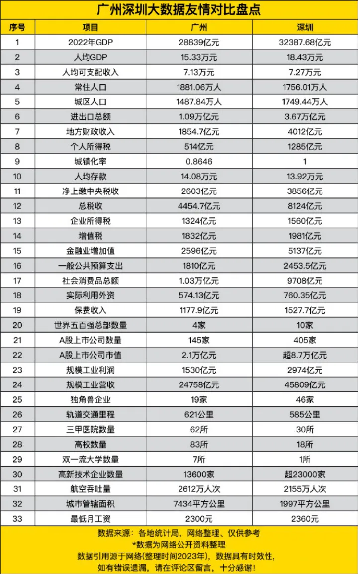 如今,深圳可以説已經駟馬難追了,廣州跟它的差距越拉越大,下面是2022年深圳與廣州主要數據對比盤點圖,無論GDP總額、人均GDP、財政收入、税收、上市公司數量等都全面碾壓廣州,只有城市面積、高校數量、三甲醫院數量等幾個指標不如廣州。
