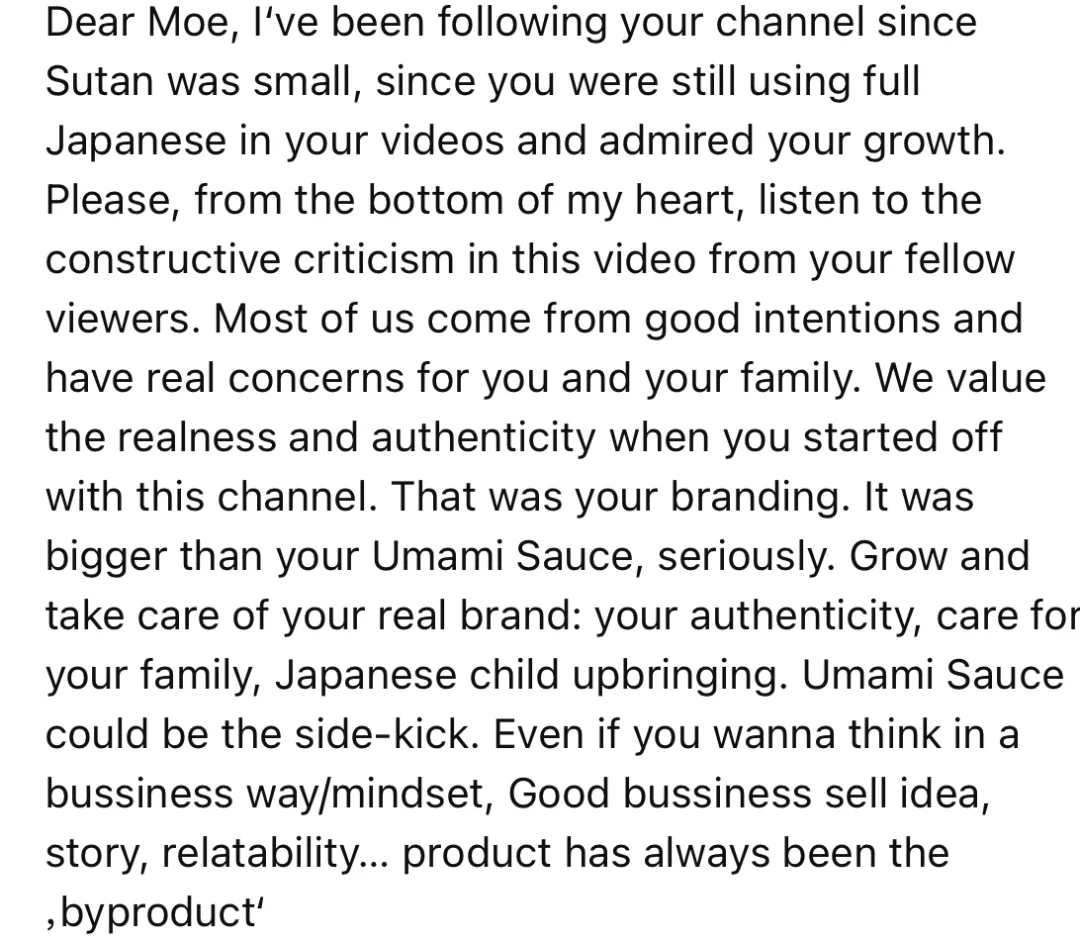 親愛的Moe,我在Sutan小的時候就開始看你的頻道,那時候你還説日語,我為你的進步感到高興。請你一定要聽下面這些差評説的話,我們都是為了你和你全家好,我們喜歡你剛開頻道時的真誠和真摯,那才是你的品牌,比賣醬油更重要。説真的,維護好你的品牌:真誠、對家庭和孩子的關心愛護。醬油只是副產品而已。